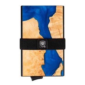 Portofel din aluminiu cu glisiere pentru carduri și protecție pentru carduri de proximitate (lemn + rășină albastră)