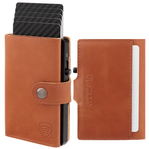 Portofel din aluminiu cu glisiere pentru carduri și protecție pentru carduri de proximitate (lemn + rășină portocalie)
