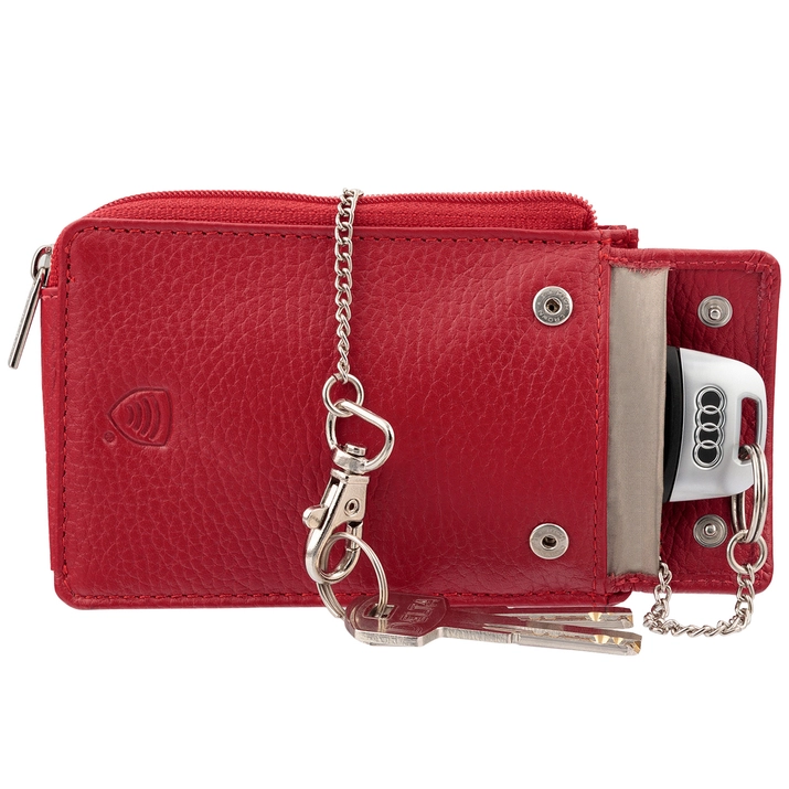 Caz fără cheie a fost confecționat cu grijă din materiale de cea mai bună calitate. Piele roșie naturală, fermoare de la grupul japonez YKK și material certificat pentru blocarea undelor electromagnetice.