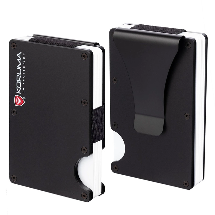 Husă de aluminiu antifurt pentru carduri cu clip pentru bancnote sau ca element de prindere la centură. Clipul este o componentă care poate fi îndepărtată prin deșurubarea șuruburilor cu ajutorul șurubelniței incluse în kit. Cărțile plasate între dale sunt ținute în poziție de benzi de cauciuc puternice.