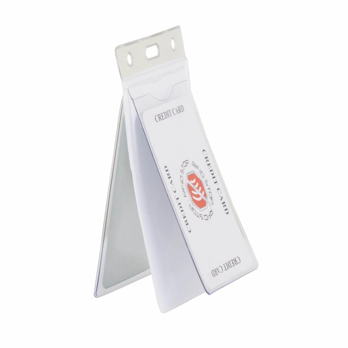 Husă pentru ecuson din folie de PVC, concepută pentru a transporta maximum două carduri. Între carduri există un ecran RFID care separă cele două carduri. O soluție utilă în cazul în care aveți mai multe carduri de acces și întâmpinați deseori o problemă la introducerea cardului în cititor, de ex. cărțile interferează între ele sau se citește una greșită. În acest caz, este suficient să rotiți ușor cardul în afara formei de undă RFID din mijloc și să îl aplicați la cititorul de carduri. În același timp, un al doilea card care atinge ecranul de separare nu va fi citit. În plus, datorită unei deschideri în partea superioară, suportul de insignă poate fi agățat la șnur pentru insignă sau retractor pentru insignă.