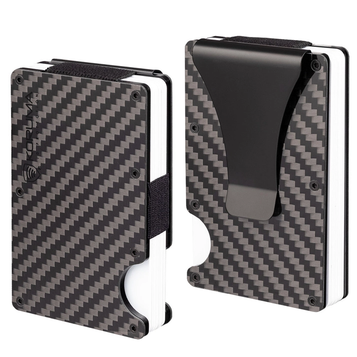 Husă de aluminiu antifurt pentru carduri cu clip pentru bancnote sau ca element de prindere la centură. Clipul este o componentă care poate fi îndepărtată prin deșurubarea șuruburilor cu ajutorul șurubelniței incluse în kit. Cărțile plasate între dale sunt ținute în poziție de benzi de cauciuc puternice. Carcasa este acoperită la exterior cu negru de carbon.