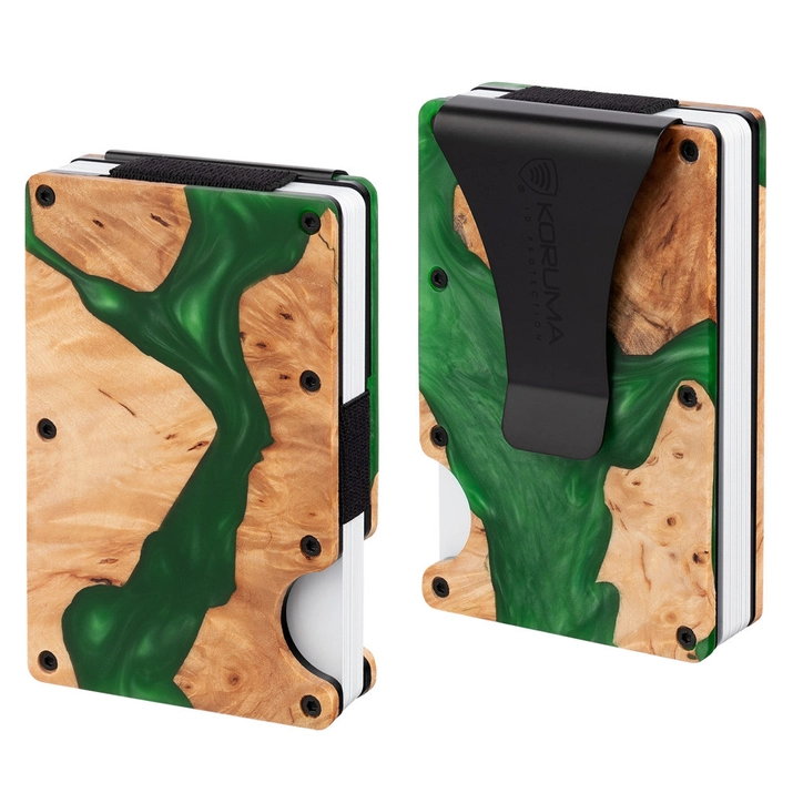 Husă din aluminiu cu clemă pentru card de credit (lemn + rășină verde)