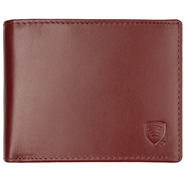 Portofel mic și subțire pentru bărbați din piele maro cu protecție de proximitate RFID BLOCK încorporată pentru carduri de proximitate.