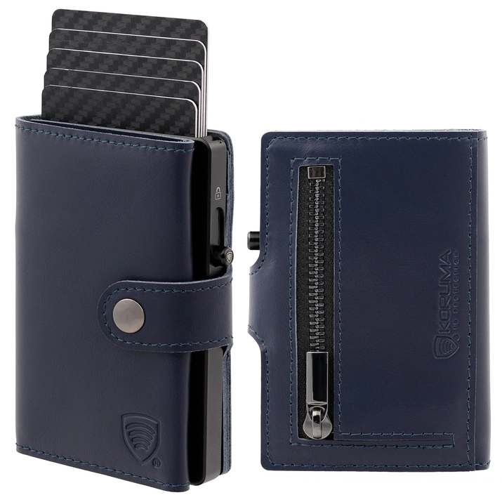 Portofel bărbătesc din piele cu buzunar pentru monede și carcasă din aluminiu (albastru marin)