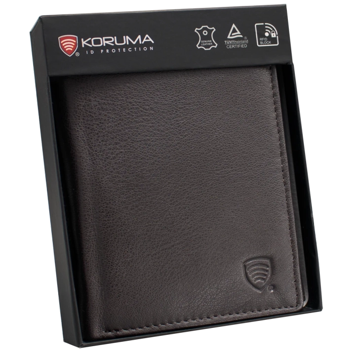 Portofel din piele maro cu o mulțime de compartimente. 8 sloturi pentru carduri, spațiu pentru cardul de înregistrare cu un capac transparent și un buzunar pentru monede. Portofelul dispune de protecție RFID BLOCK™ pentru carduri de proximitate.