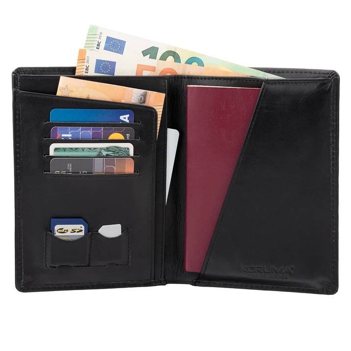 Portofel din piele pentru carduri de plată și documente, de exemplu pașaport biometric sau carte de înmatriculare auto. Cazul este realizat din piele naturală de culoare neagră. Pe lângă cardurile și documentele menționate mai sus, portofelul are loc pentru o cartelă SD sau o altă cartelă de memorie și o cartelă SIM pentru telefonul mobil. Portofelul are încorporată protecția RFID BLOCK™, care securizează toate documentele de proximitate care pot fi citite de la distanță fără a atinge cititorul.