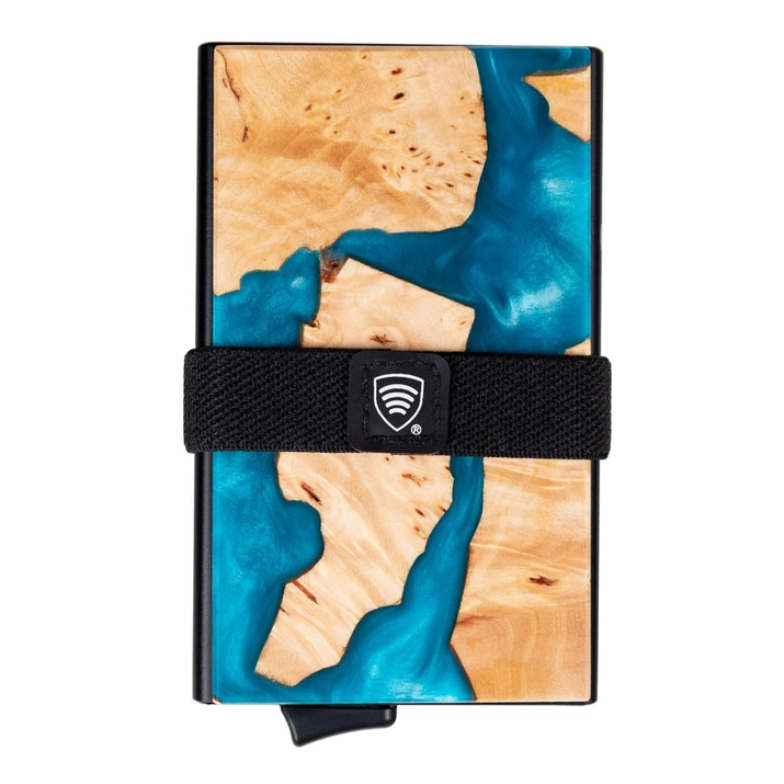 Portofel din aluminiu cu carduri extraibile și protecție pentru carduri de proximitate (lemn + rășină turcoaz)