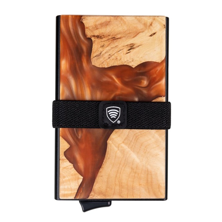 Portofel din aluminiu cu glisiere pentru carduri și protecție pentru carduri de proximitate (lemn + rășină portocalie)