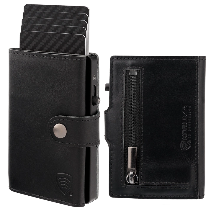 Uitați de compromisuri! Portofelul nostru elegant, în care am combinat rezistența unei carcase din aluminiu cu farmecul clasic al pielii, este conceput pentru a răspunde tuturor așteptărilor dumneavoastră. Această combinație oferă două sloturi suplimentare pentru carduri, inclusiv o așa-numită fereastră, care este ideală pentru o carte de identitate sau fotografii ale celor dragi.